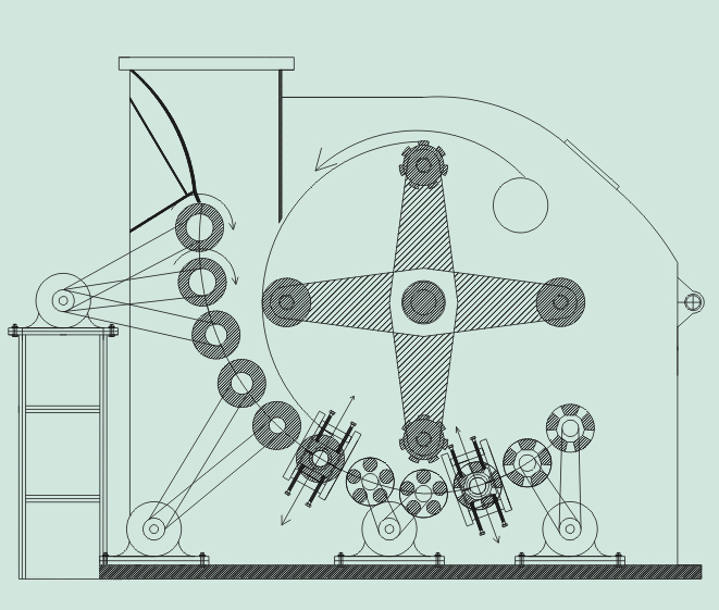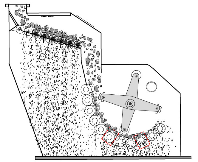 破碎物料進入粗破的形式,由粗輥與反擊板相互刮削打擊運動使大塊物料破碎,然后進入篩分系統(tǒng)達到粒度要求的直接送進鍋爐,未過到要求粒度的再進行到細破置進行破碎,兩細破輥子相對差速運轉(zhuǎn),具有相互刮削作用而強制排料,采用原料自由落差,全進全出,對物料水分無任何要求。